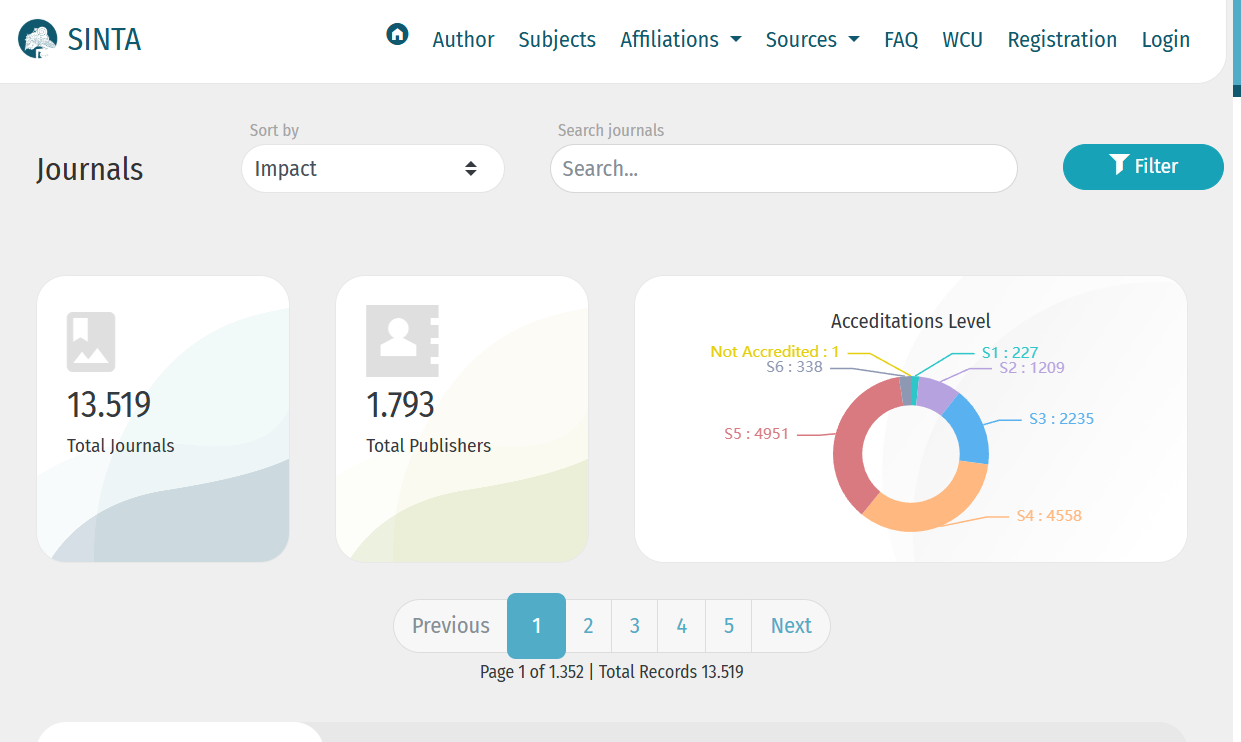 Langkah pertama, pilih menu “Journals” pada halaman utama SINTA. Setelah itu, Anda akan melihat kolom pencarian yang dapat diisi dengan nama jurnal, ISSN, atau kata kunci tertentu. Ketikkan informasi jurnal yang ingin dicek, lalu tekan tombol pencarian.
