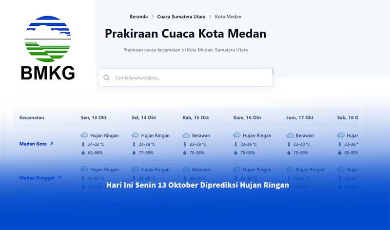 BMKG Memprediksi cuaca di Medan hari ini Senin 13 Oktober didominasi hujan ringan dengan potensi petir